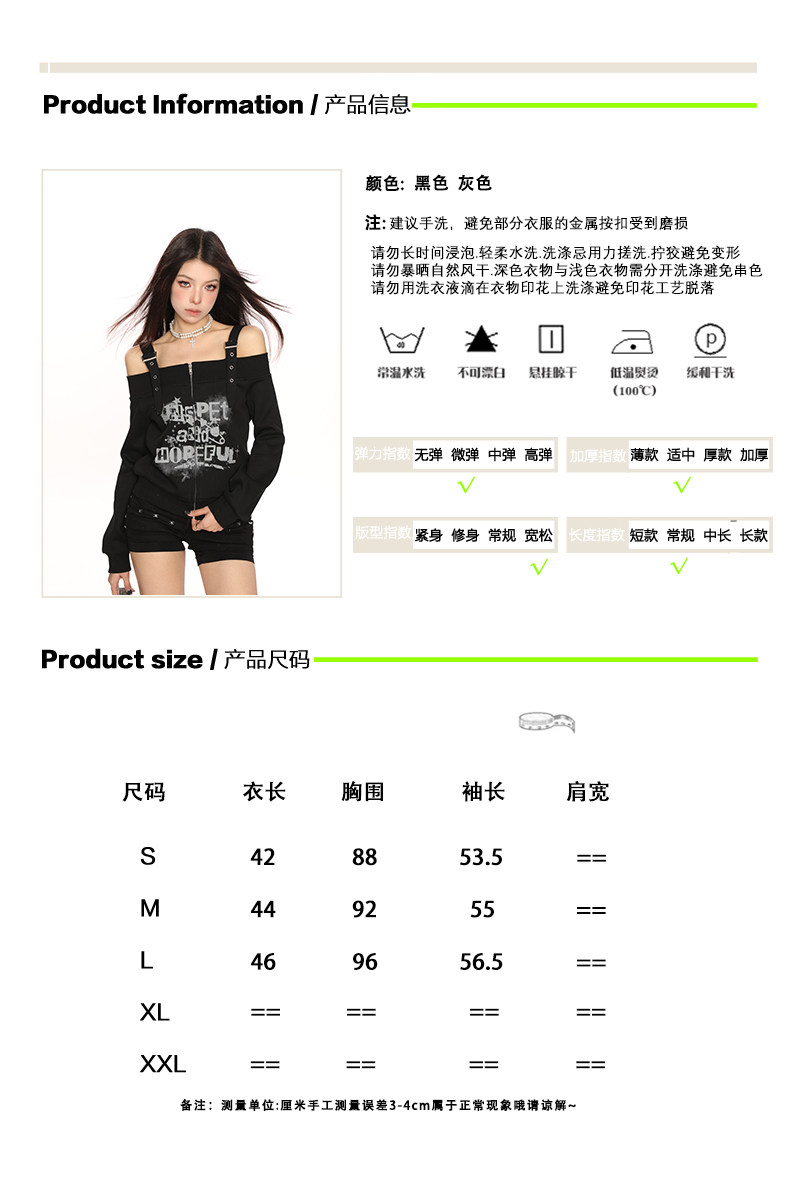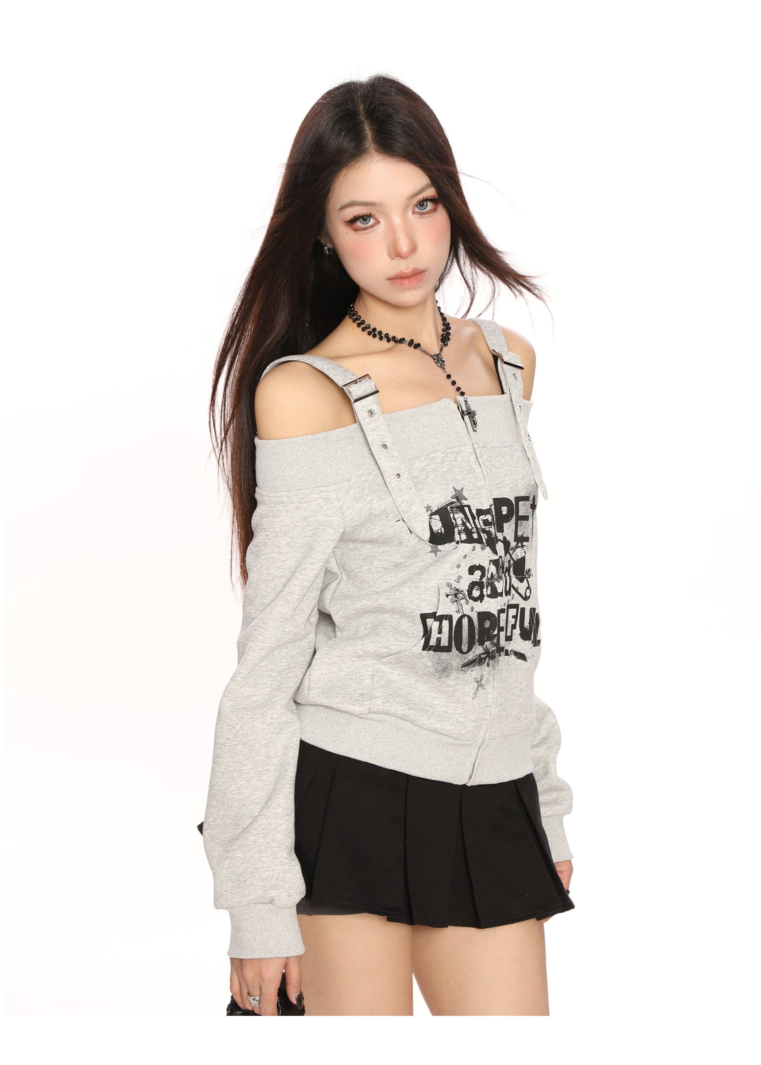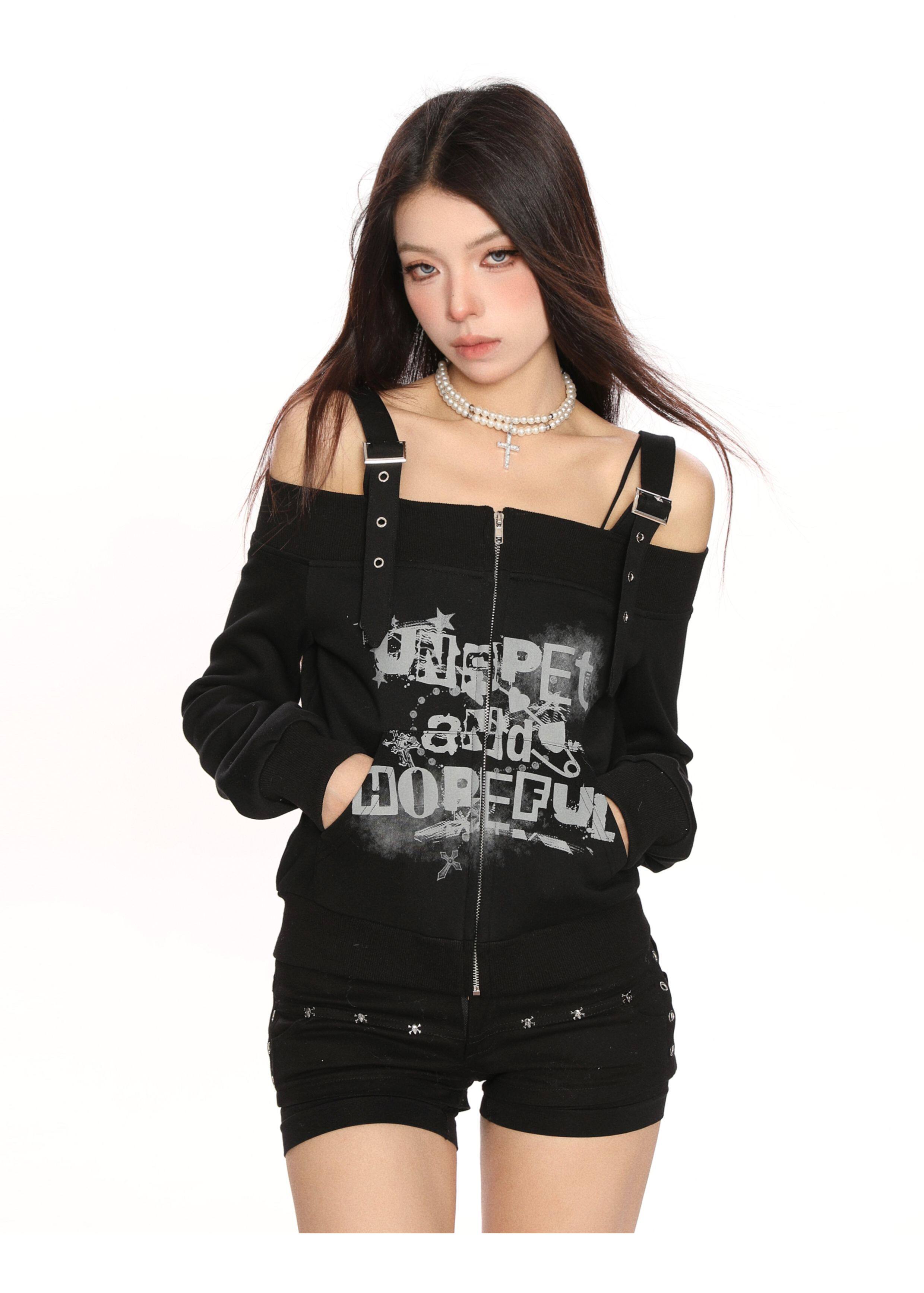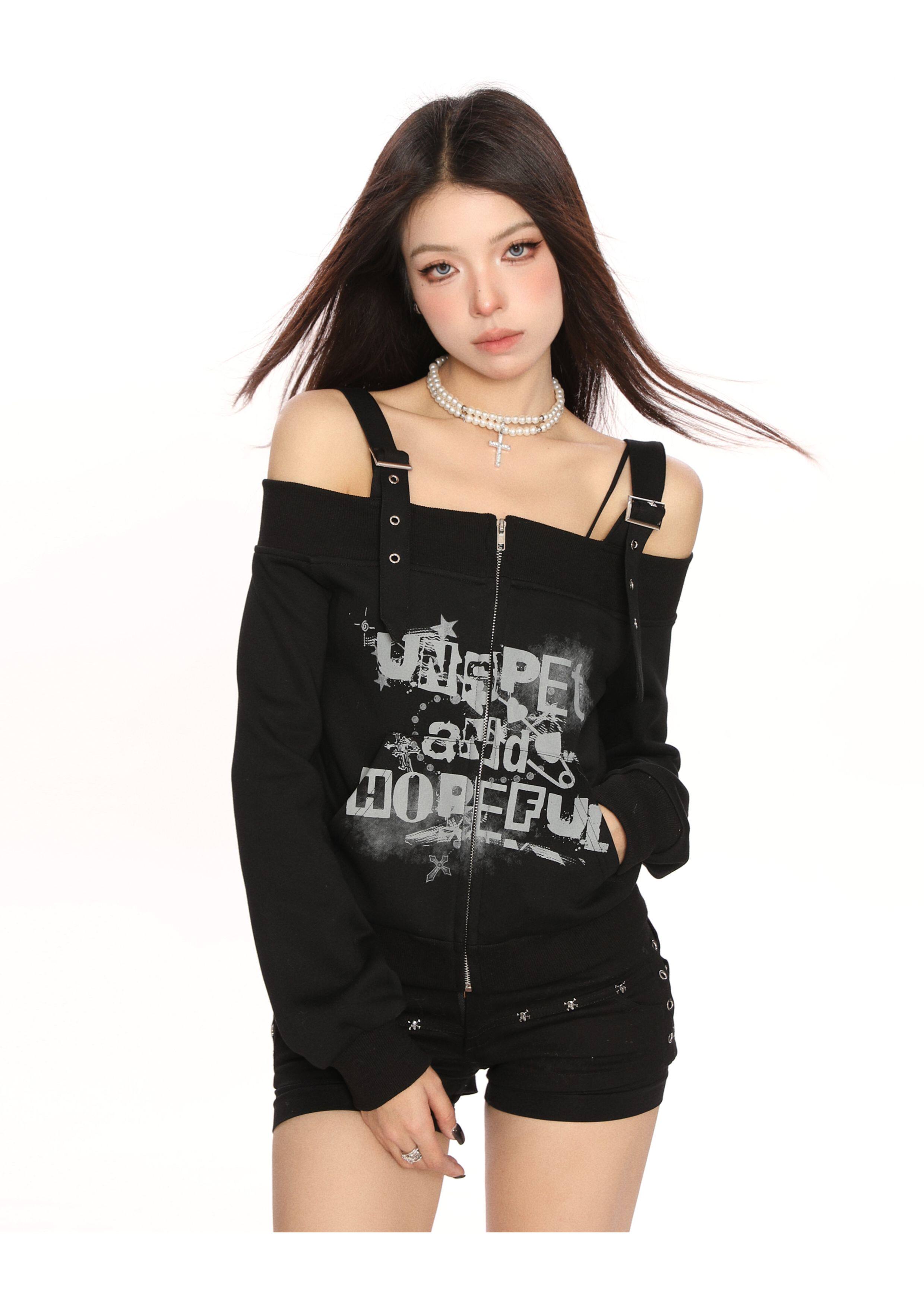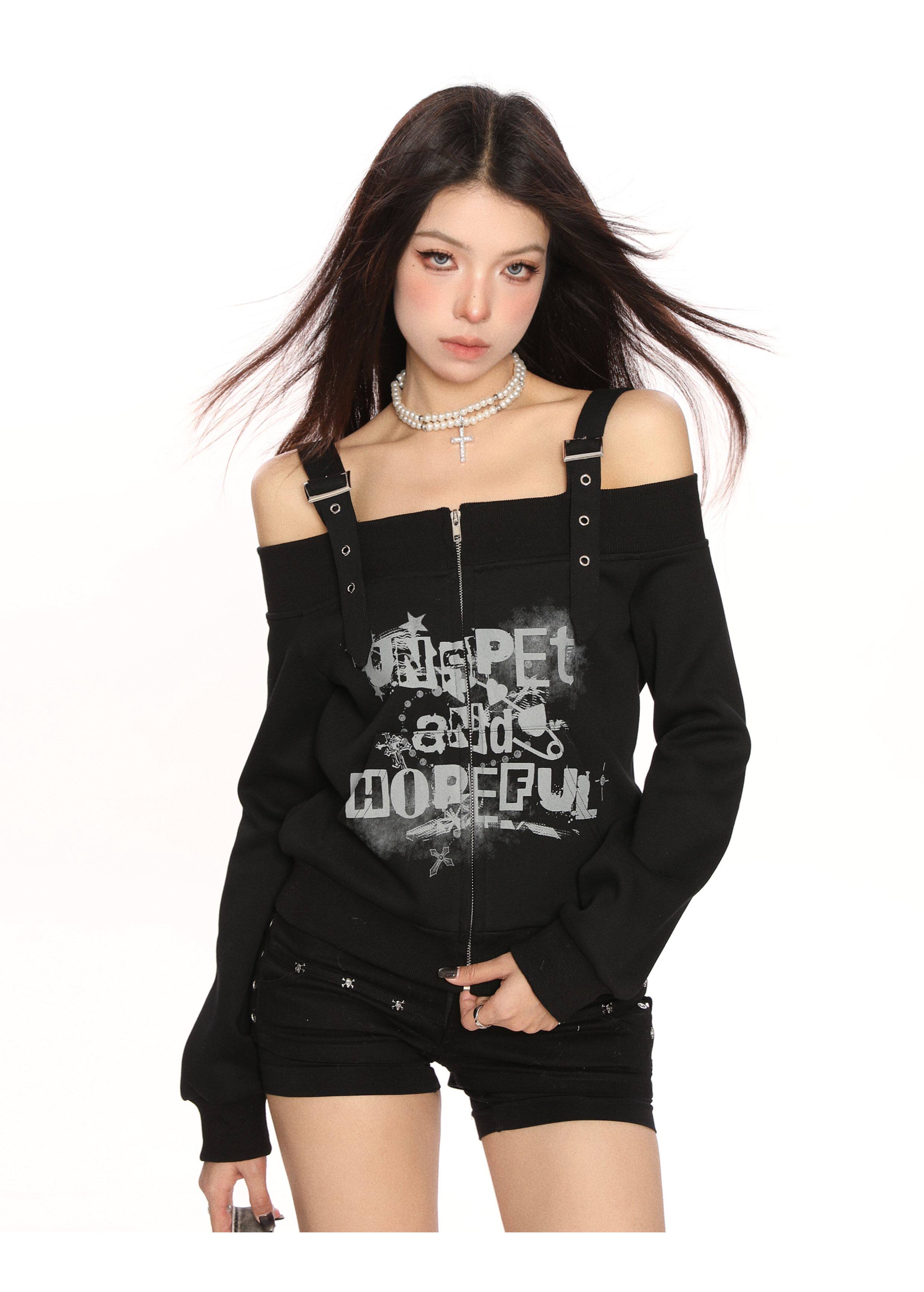 y2k朋克塗鴉吊帶一字肩衛衣女春秋修身顯瘦辣妹露肩上衣潮