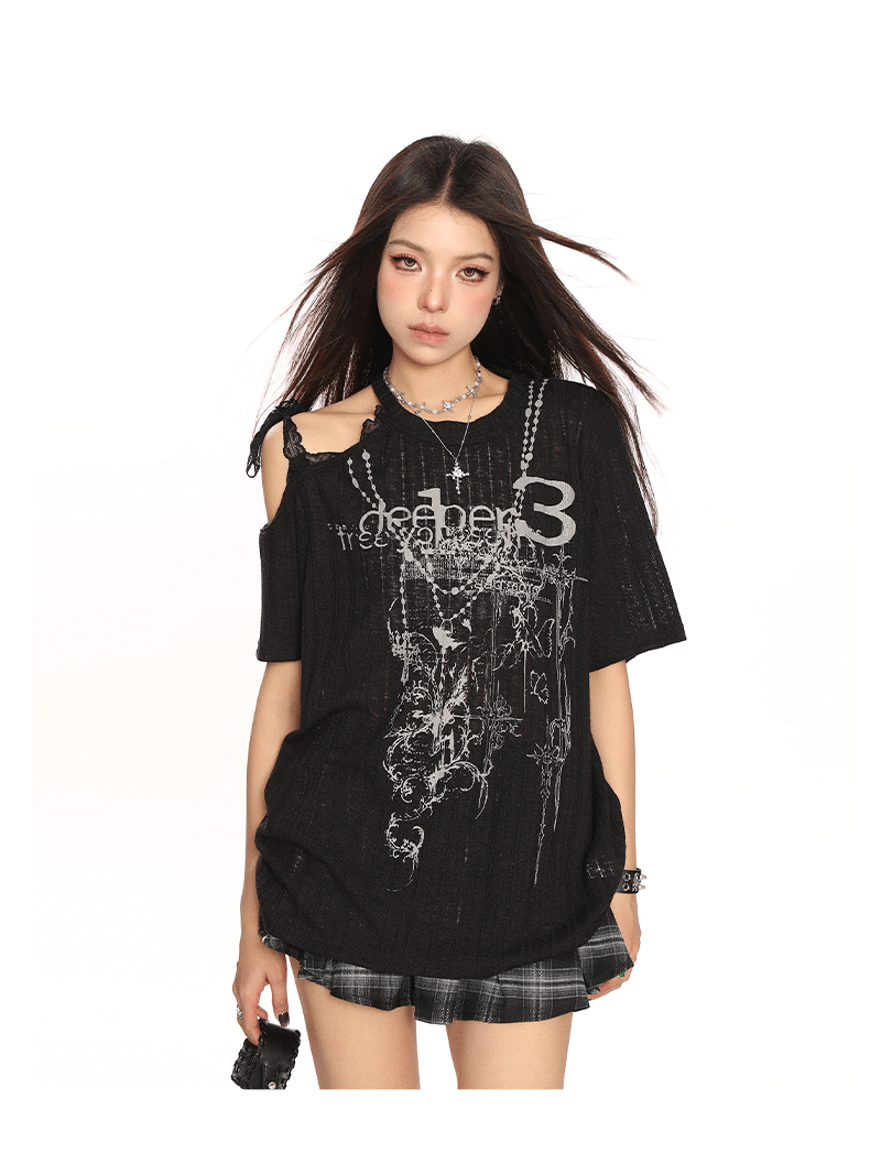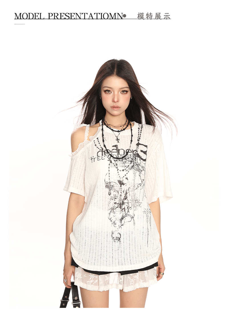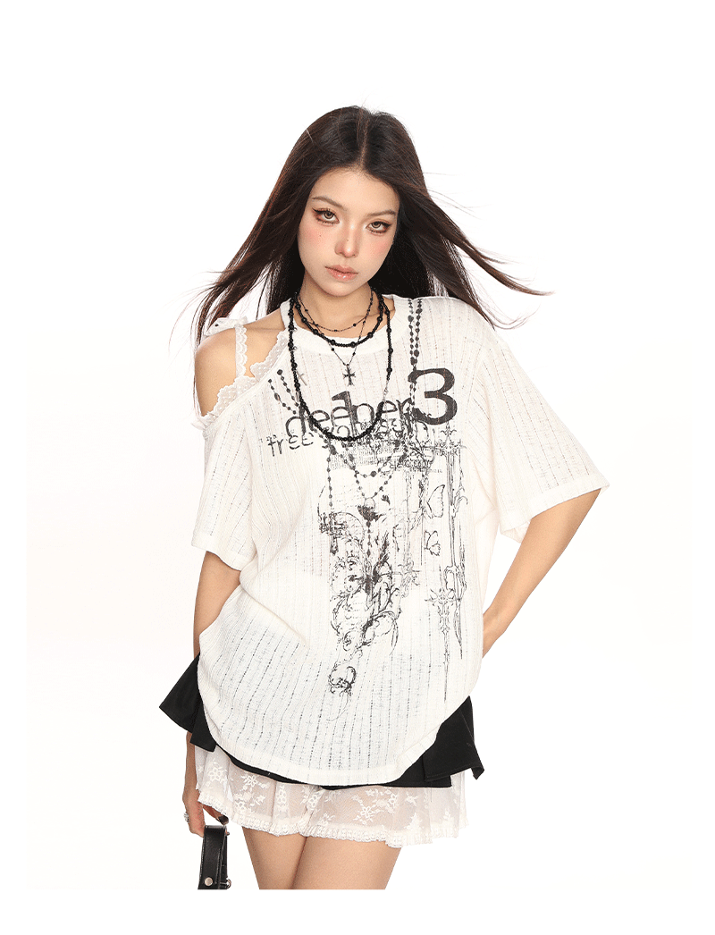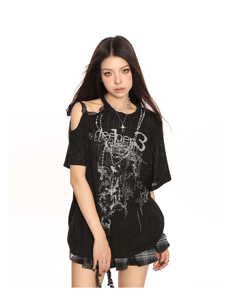 甜酷y2k蕾絲漏肩綁帶短袖T恤女夏季慵懶風寬松顯瘦上衣潮
