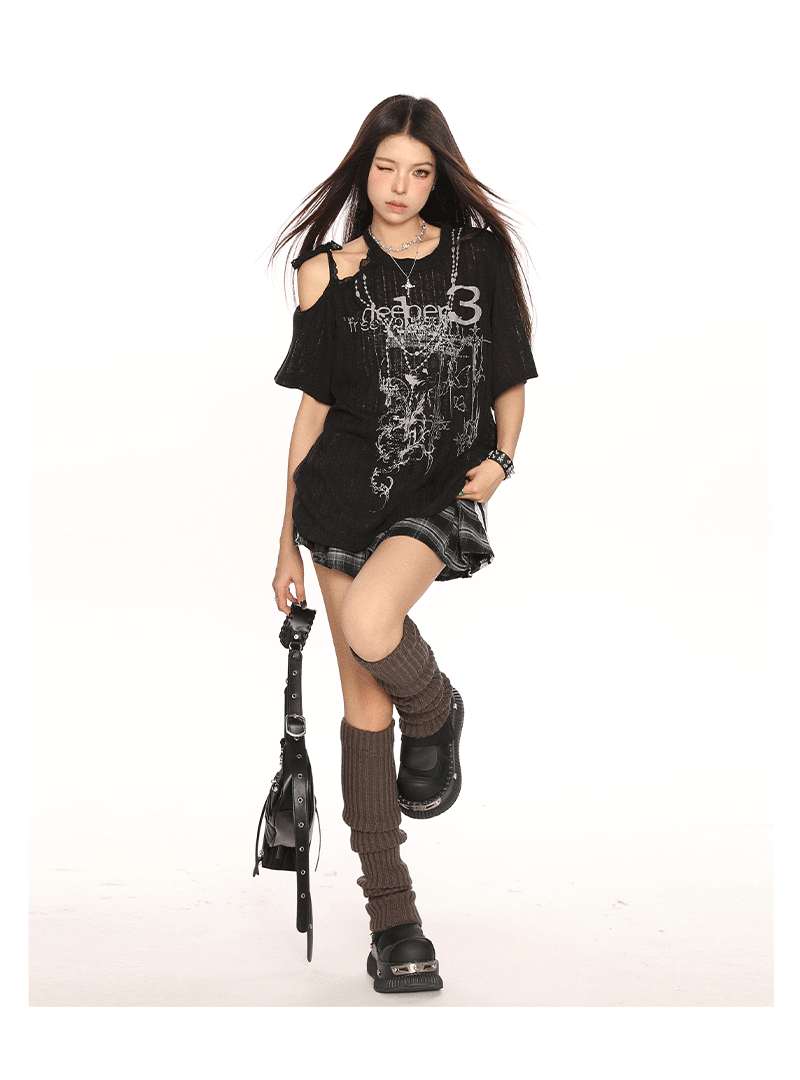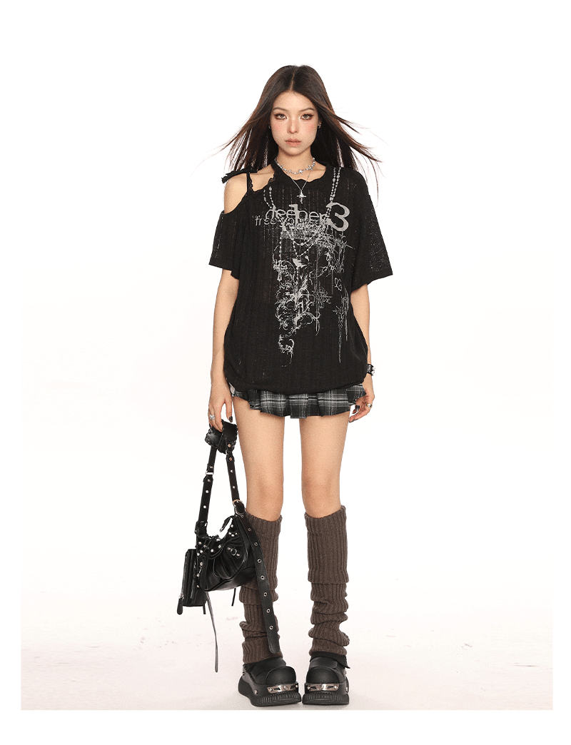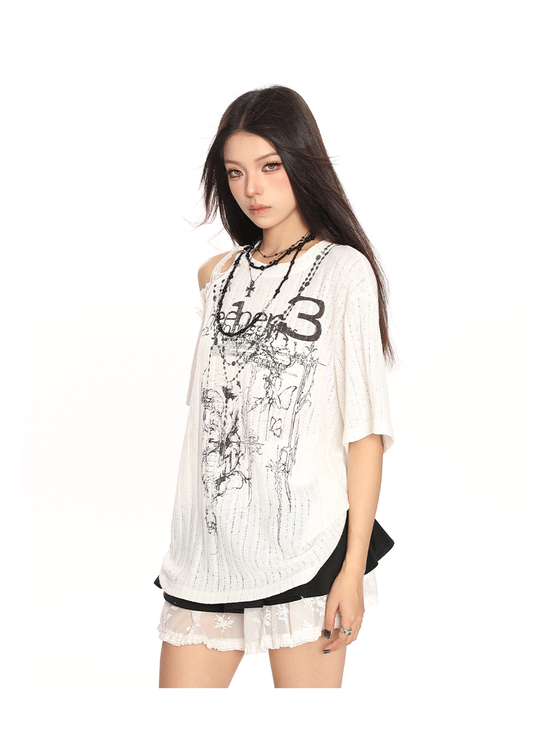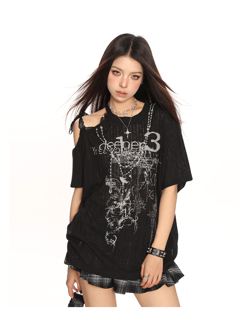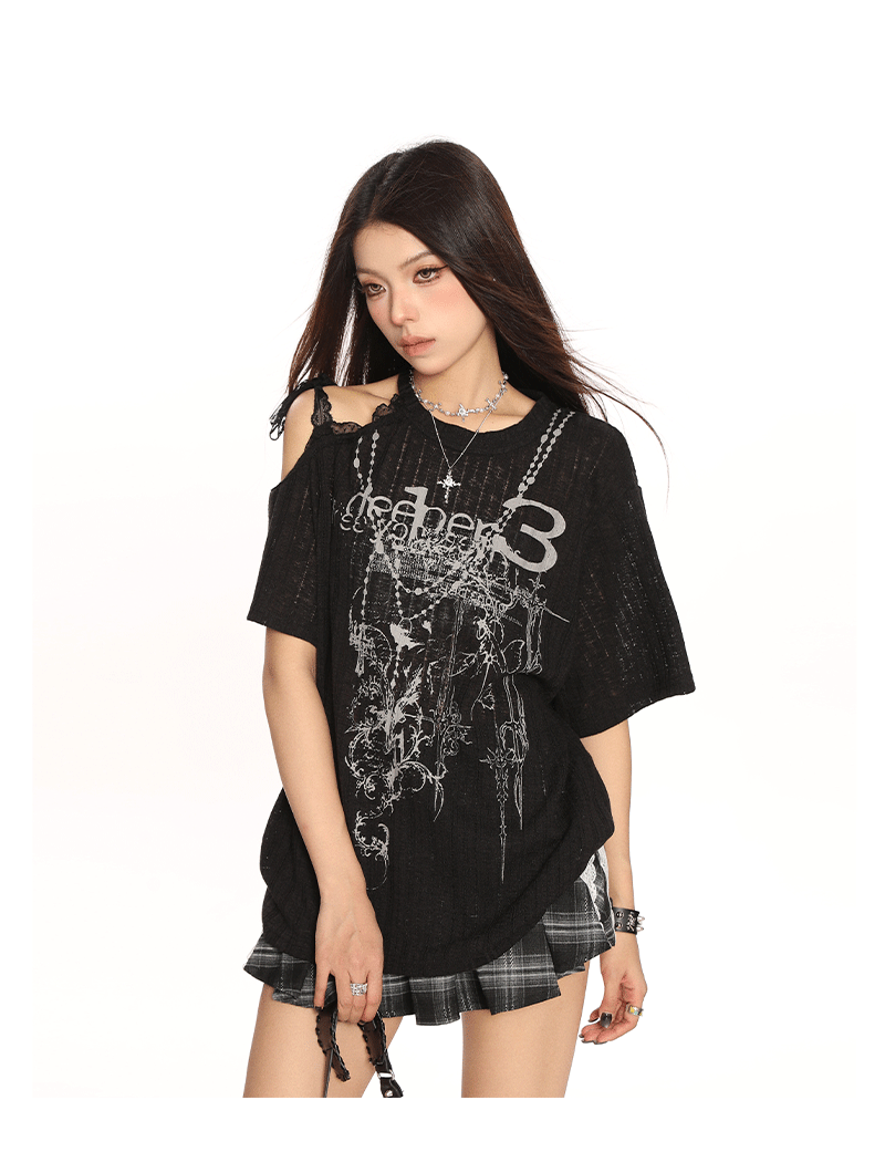 甜酷y2k蕾絲漏肩綁帶短袖T恤女夏季慵懶風寬松顯瘦上衣潮